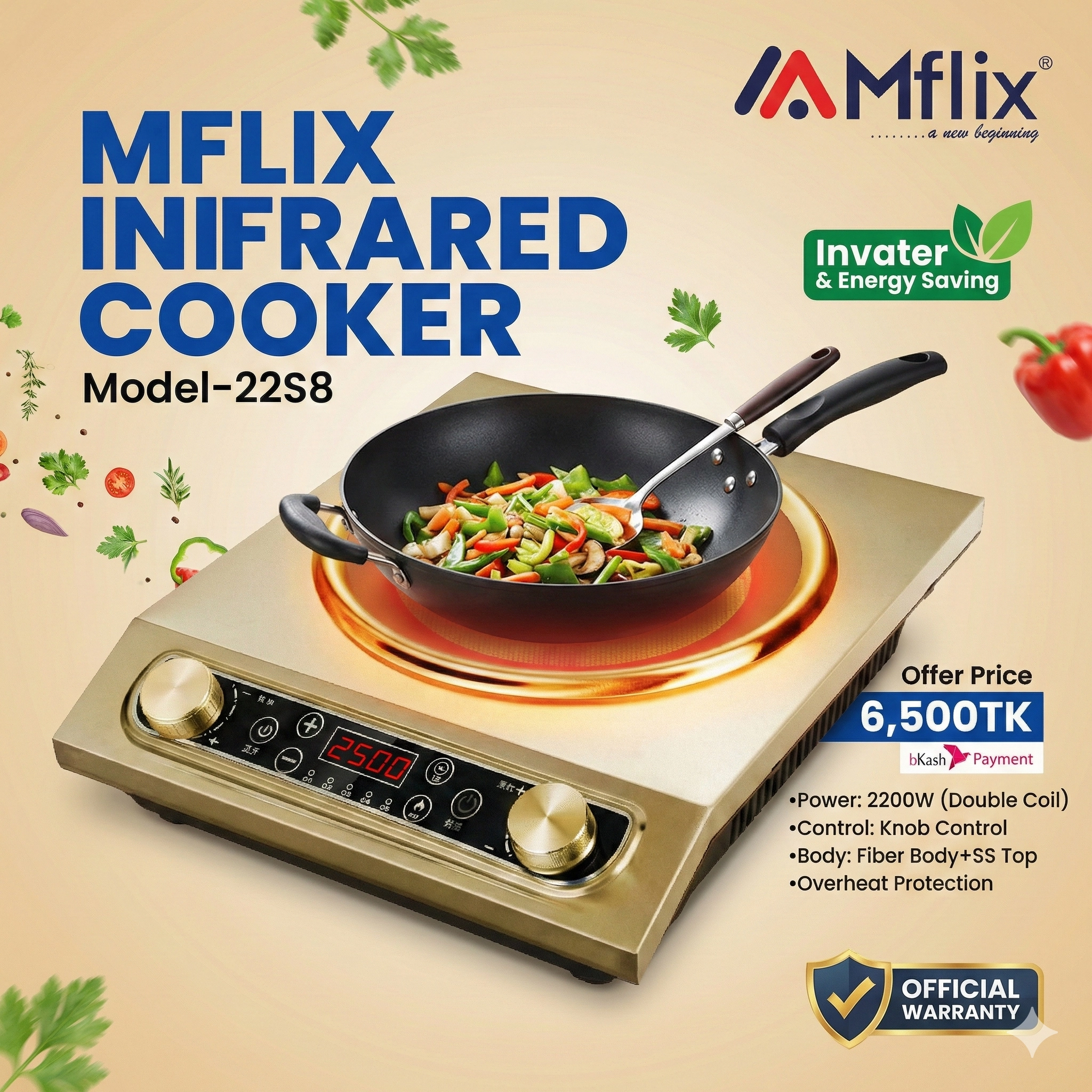 Power up your kitchen with the MFLIX MIC-22S8 Infrared Cooker. This model is built for heavy daily use. It combines a Deep Body design with a durable Stainless Steel (SS) Top. With 2200W of Double Coil power, it ensures your food cooks fast and evenly.
