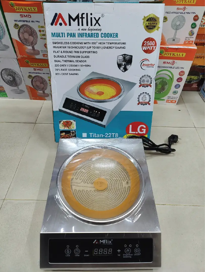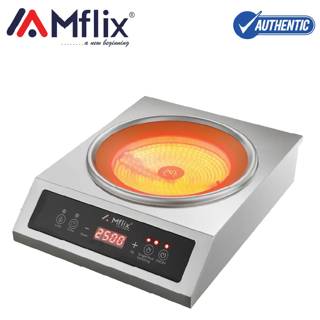 Ultimate Strength. Smart Touch. The MFLIX MIC-22T8 is a premium 2500W Infrared Cooker featuring a hybrid Full SS + Titanium Body. With Dual Fan Cooling, an Oval Design, and smart Touch Control, it offers heavy-duty performance for any pot.