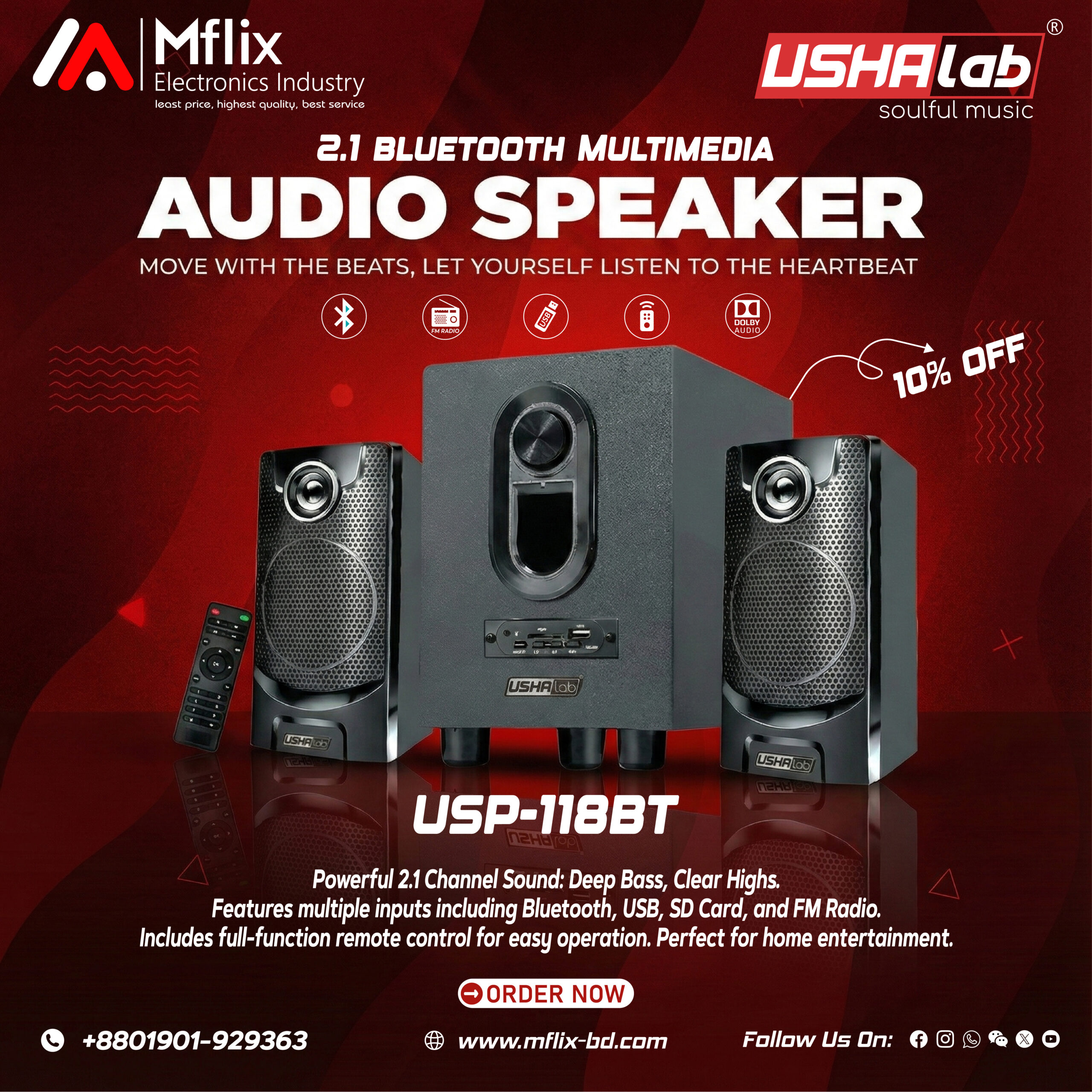 Precision Audio. Refined Design. Experience the perfect balance of performance and style with the USHALAB USP-118BT. This 2.1 channel multimedia system drives 20W of powerful, crystal-clear sound through a dedicated subwoofer and dual satellites. Equipped with Bluetooth, USB, and SD inputs, it is the versatile audio hub your home needs.