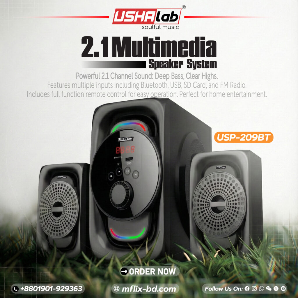 Are you looking for a sound upgrade? The USHALAB USP-209BT is here to transform your audio experience. This 2.1 multimedia speaker system combines power with a sleek design. It is perfect for any modern home in Bangladesh.