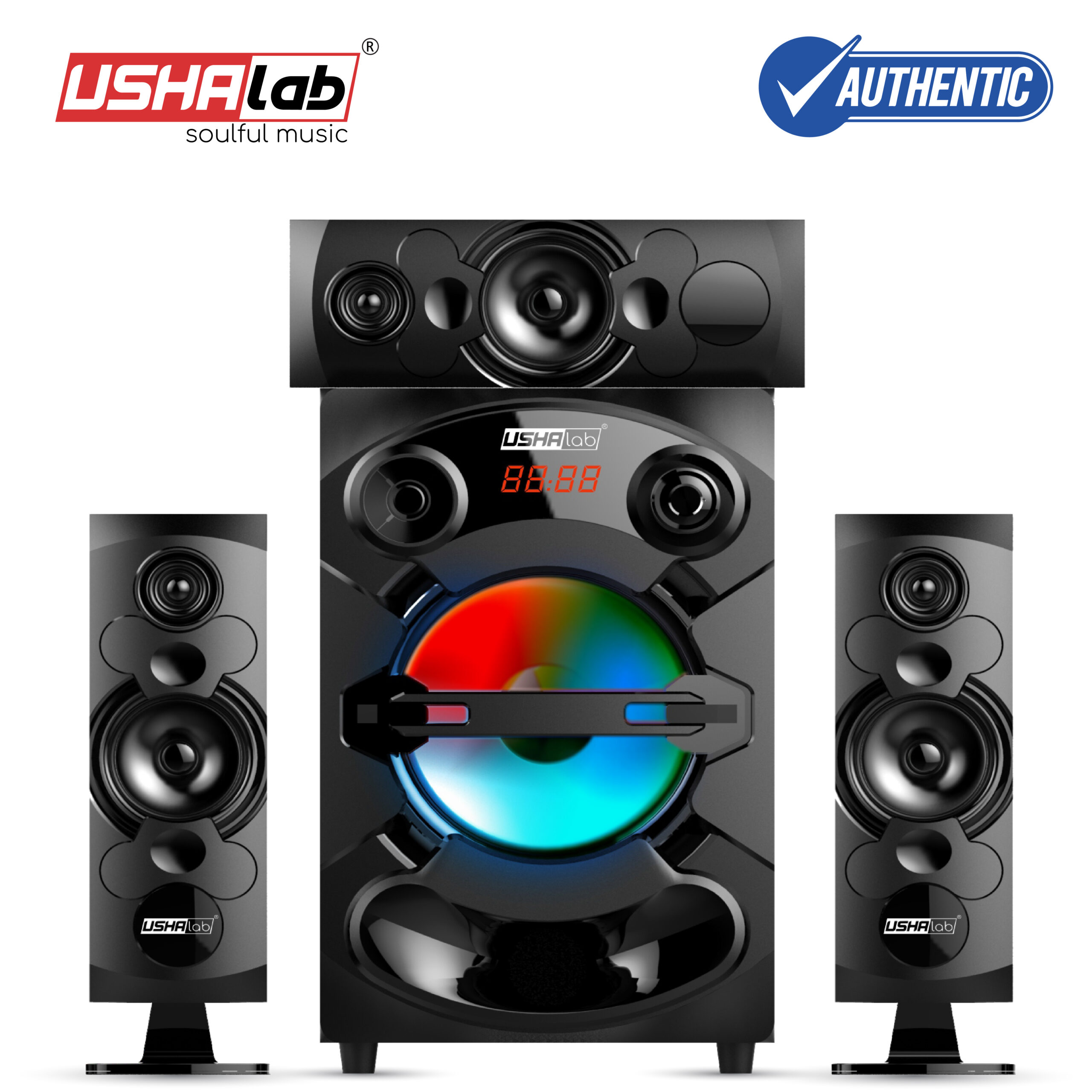 3.1 Channel Immersion. Dynamic Power. The USHALAB USP-305BT is a powerful 3.1 channel system delivering 70W RMS. With a 7.5-inch subwoofer, three satellites, and vibrant Music Lights, it creates a cinema-like audio experience. Includes a 1-Year Warranty.