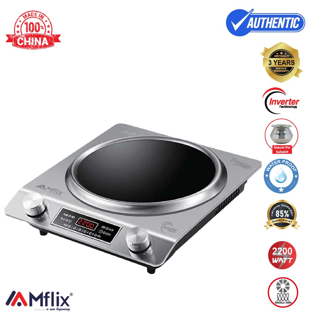 This 2200W model features Inverter Technology (up to 85% energy saving) and a durable Stainless Steel Body with a tempered glass top. It uses Infrared heating and is compatible with ALL types of flat and round-bottomed cookware (Oval + All Pot). Control your cooking precisely with the easy Knob Control. Includes Overheat Protection and is Water-Proof.